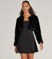 Add a touch of luxury to your ensemble with this elegant faux fur crop jacket. Its plush fabric gives an opulent feel. perfect for adding sophistication to any look. The jacket's cropped length makes it a chic pairing with cocktail dresses. formal jumpsuits. or dressy pants ensembles. With its clean. collarless design and discreet front fastening. this jacket offers a modern take on classic bolero styling.