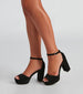 Complete your look with heels that elevate your outfit! The heels feature a closed-back. adjustable ankle strap. a peep toe with a wide strap over the toe. a wide platform. and a block heel. The heels are composed of a faux nubuck material. Complete look with a high low dress and dainty charm necklaces.
