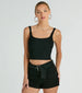 Update your essential basics with this sleeveless tank top to dress up or down! The rib knit top showcases a flattering square neckline with shoulder straps and a fitted crop hem perfect for flaunting your figure. Complete the look with a trendy skort and jacket.