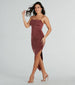 Experience an evening of bliss in this chic midi dress! Featuring a folded square neckline and spaghetti straps. and a bodycon silhouette that flatters your figure while the side ruched seam accentuates your curves. The asymmetrical midi length hem adds a stylish touch to this midi dress. perfect for any dressy occasion! Complete the look in block heels.