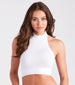 This everyday basic seamless ribbed knit crop top needs to be in your lineup! It features a sleeveless mock neckline with a halter design. a partially open back. and a fitted. banded. cropped hem. The lightweight knit fabric offers plenty of stretch for comfortable wear. Style with sculpting biker shorts.