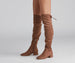 These faux suede over-the-knee boots will bring everyday chic vibes! They feature an on-trend pointed toe. an inner zipper closure. a short block heel. and a tie-back detail. Style these boots with a classic plaid scarf.