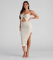 Express your stylishly bold self in this midi dress! It features a strapless. bandeau top with a string tie o-ring. cutout bodice. and midi bodycon skirt with a sultry side slit. Composed of ribbed knit fabric with a moderate stretch. Finish the look in oversized sunglasses.