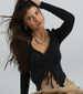 This cute crop top is designed with fitted long sleeves. a flattering V-neckline. and an adjustable drawstring with a slit to add some sass to your look! The top is crafted from a soft and smooth brushed knit fabric for extra comfort. Style the crop top with flare pants for a trendy casual look!