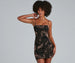 Looking for something sweet? This mini dress will surely fulfill your craving! It features sleek bungee spaghetti straps. a square neckline. and a swirl marble pattern on the short bodycon silhouette. Composed of a lined mesh fabric with a moderate stretch. Style with lucite mules for date night.