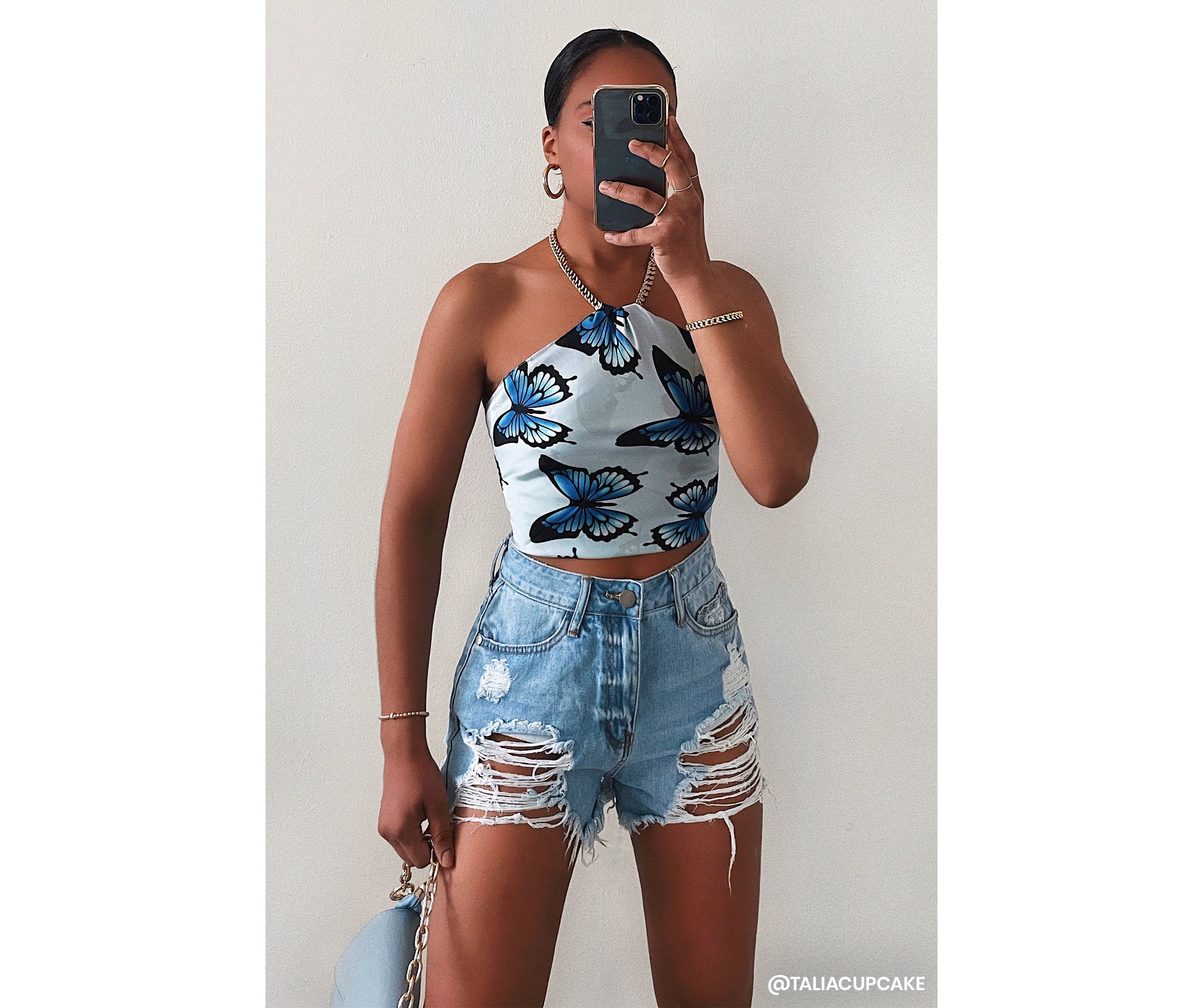 Keep it fab and fluttery with a cute scarf that accents your look! The versatile scarf can be styled as a head wrap. top. and traditional wear. The scarf features a pretty butterfly print and is composed of a satin-like material. Complete look with high waist jeans.