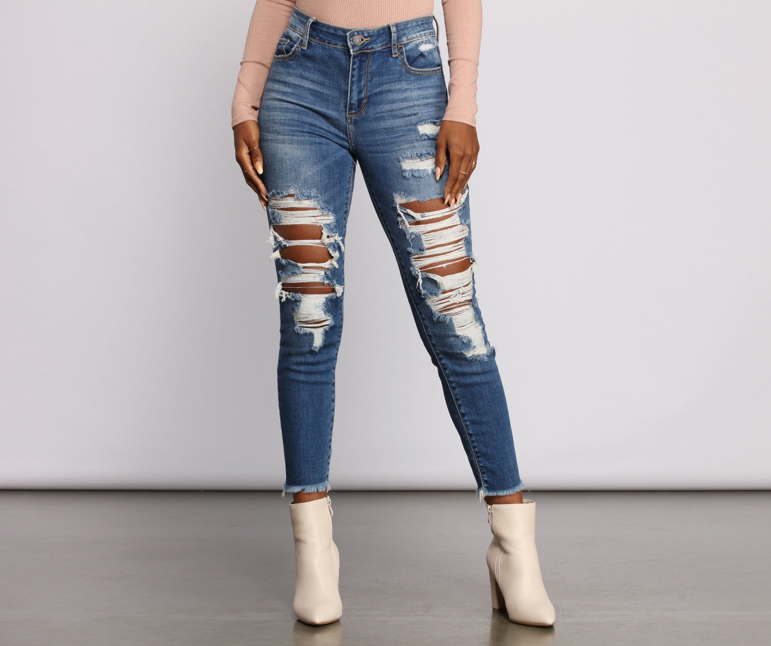 Keep it fab in jeans that bring the drama! These must-have skinny jeans feature a mid-rise fit. heavy destruction throughout and a skinny leg fit. Complete look with a basic bodysuit to let the destruction speak for itself.