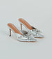 Step out and show off a fabulous sheen in these metallic strappy stiletto mules! The closed pointed toe features criss-cross adjustable straps with a sleek buckle and grommet detailing for a trendy vibe. The chrome finish on the faux leather material will level up your glam 'fits. The open back provides effortless on-and-off styling. leading to the chic stiletto heel. Complete the look with hoop earrings.