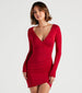 This autumn. you'll fall for this surplice sweater dress that's cozy and stylish! The mini dress features long sleeves. a plunge v-neckline. a bodycon silhouette. and a side ruched seam leading to the asymmetrical wrap hem. Complete the look in tall boots and a coat for a perf fall vibe.