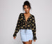 Fall in love with this adorable floral blouse and add a flirty vibe to your outfit! It features long blouson sleeves with flared hems. a V neckline. an elastic banded seam under the bust leading to a center tie-front. and a flowy. mid-length hem. The top is composed of a lightweight semi-sheer woven fabric with an all-over floral print and no stretch. Pair this blouse with denim shorts and cute sandals for a picnic date.