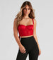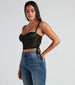 Be their fantasy showing up to the party or club in this sultry bustier featuring a sleeveless sweetheart neck. adjustable spaghetti straps. built-in padded bust with underwire. flexible boning along the sheer cropped bodice. and flirty side lace-up packets. Complete the look in flare jeans and heels.