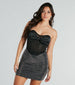 Add subtle fashion flair with this mesh corset top to any look! It features a strapless neckline with non-slip grip lining. a statement satin bow. a sheer mesh bodice with flexible boning inserts. and a fitted crop hem. Style with trendy best-selling jeans for a holiday party or cocktail bar!