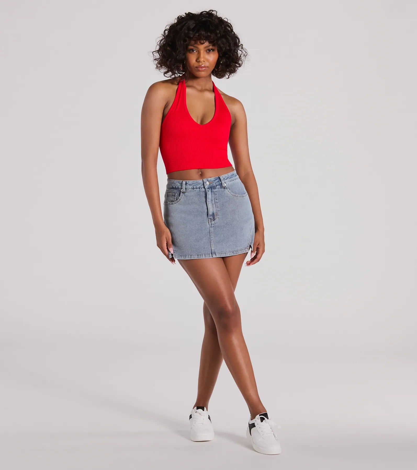 This denim skort is about to be your favorite look for simply cute outfits! Made from a medium-wash denim fabric. this mini skirt boasts a flattering high-rise waist with button closure. a form-hugging fit. and a front skirt overlay with flirty side slits and shorts bottom. Complete the look with a halter bodysuit and sneakers for any casual plans!