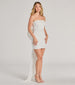 The Faye mini dress is crafted with a dainty lace fabric that will exude those soft feminine vibes. The strapless bodycon dress features a large bow accent with a floor-length cascading train for that iconic coquette aesthetic. The bow is also removable to let you switch up your look! Style with stiletto heels for a formal party.