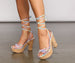 Spice up a summer outfit wit these fun cork heels. These heels feature an open almond toe. tie-dye lace up straps. a wide platform and a cork heel. Pair them with a basic bodysuit and denim shorts.