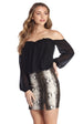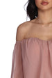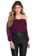 This plum chiffon top will have you feeling like a boss! It features a stretchy off the shoulder neckline. long sleeves with elastic cuffs. a bubble hem. and a contrasting back knit panel for added stretch. Top is composed of a chiffon fabric with a relaxed fit and minimal stretch and includes a lightly padded bust.