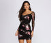 So fresh and so fine! This mini dress features a straight neckline. long sleeves. and a short hemline. Sleeves are sheer and sides of the dress are ruched for a curve flattering fit. Dress is lined with a smooth inner lining. and the overlay is composed of a mesh material adorned with foiled floral. Dress offers moderate stretch.