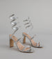 She's glam. she's bold. she wraps you in sparkle—literally. These spiral strap block heels are made for main stage moments. with rhinestone embellishments and a metallic finish.