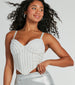 Embolden your style in this stunning bustier sure to be the talk of the town! Designed with intricate rhinestone and faux pearl embellishments for major glamour. this crop bustier features detachable and adjustable spaghetti straps for styling options. a non-slip grip lining along the sweetheart neckline for a secure fit. padded bra cups eliminating the need for a bra. and is finished with multiple back hook and eye fasteners for a perfect fit. Complete the look in high-rise denim jeans. heels. and earrings for an unforgettable night out!