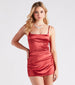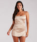 You'll be feeling yourself in this satin romper from dinner and drinks to the after-party! it features a sleeveless square neckline. spaghetti straps. a bodycon silhouette. a side pleated seam. and a wrap-style front skirt overlay with a short-length hem. Complete the look in a glam necklace for a GNO!