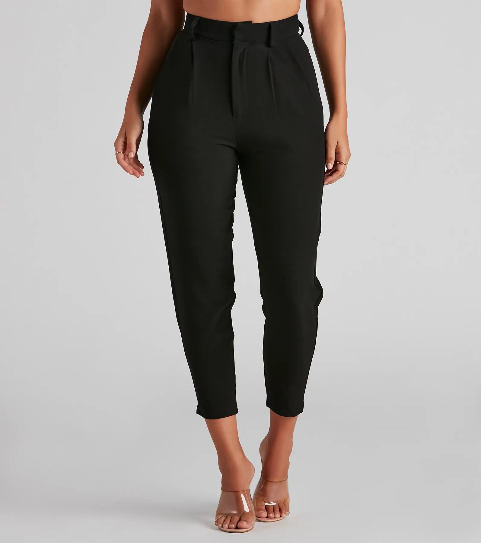 Keep your look chic and poised with these smooth woven trousers. They feature a high-rise fitted waist. belt loops. front pockets. pleated detailing. and a tapered. skinny leg fit. Style these dress pants with a basic bodysuit and strappy heels.