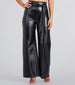 These on-trend faux leather wide-leg pants will have you feeling sleek and chic! They feature a high-rise waist with a tie-front design. a hip-hugging fit. and a wide-leg silhouette. The smooth faux leather fabric offers a moderate stretch. Complete your elevated look with a cropped bustier and clear heels!
