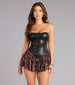 For nights when you're feeling bold. this one does all the talking. A faux leather. corset-inspired bodycon dress with a flirty leopard ruffle hem—equal parts fierce and flirt. It's the outfit version of “don't wait up.”