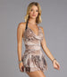 This animal print mini dress was made for turning heads. With its draped cowl neckline. strappy halter fit. and flouncy layered hem. it's a party dress with untamed vibes.