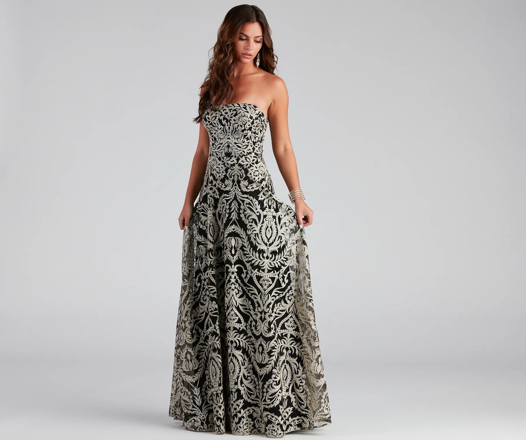 Get swept up in a formal dress that brings the elegance to prom! Filippa features a sleeveless square neckline. supportive padded cups. and removable adjustable spaghetti straps. She features a metallic embroidered baroque pattern throughout that creates a regal vibe. Her slim-fit bodice leads to an enchanting A-line silhouette. She is composed of a lined mesh fabric that offers a flowy fit with minimal stretch. Complete outfit with rhinestone heels and a tennis bracelet.