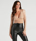 Graceful and poised. this rib satin top will inspire your inner ballerina! It features long bell sleeves. a V-neckline. and a surplice cropped hem with a wrap tie-back that lets you customize the style. Complete the look in a flirty skirt and lace-up heels.