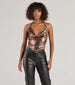 Flashy and fierce. level up your going-out look with this metallic foiled knit crop top! It features a sleeveless draped cowl neckline. halter spaghetti straps with a tie-back design. an alluring open back with lower tie-back straps. and a cropped hanky hem.