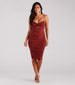 You'll want to flaunt your sultry 'fit in this ruched bodycon midi dress that will showcase your gorgeous figure! It features a sleeveless sweetheart neckline with a padded bust. a twist-front design with a center keyhole cutout. spaghetti straps. ruching down the side seams. and a midi-length hem with a curve-hugging silhouette. The slinky knit fabric includes a full-length lining and has plenty of stretch. Style with lace-up heels!