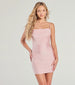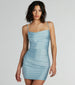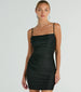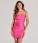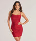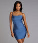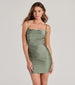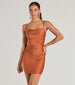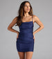 Show off a flawless allure in this figure-flaunting mini dress! Designed with a sleek knit fabric with a fab sheen. this mini-length dress offers plenty of stretch so you can dance all night. The sleeveless bodice is shaped with a pleated cowl neckline for a chic draped effect and spaghetti straps. The pleating across the bodycon silhouette will accentuate your stunning curves. Style with metallic heels for a club night out.