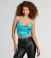 Show off your flawless allure in this slinky knit fringe hem crop top! Designed with a sleek stretchy knit fabric with a fabulous sheen. this is the perfect going-out top for nights out with your squad. It features a sleeveless cowl neckline for that chic draped look. and bungee spaghetti straps that lead to a sultry open back with a cross-back strappy design. The angled cropped hem is accented with a ball-chain fringe for a trendy vibe. Style this form-hugging top with faux leather pants and clear heels.