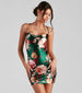 Bring your flirty style to your date night look in this gorgeous satin floral mini dress! It features a sleeveless cowl neckline. spaghetti straps. an open back with a lace-up strappy design. and a short. curve-hugging. bodycon silhouette. Complete the look with sleek hoop earrings.