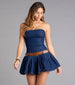 From brunch to concert nights. this strapless denim dress delivers instant style. The cinched belt and playful skater skirt keep the vibe equal parts sweet and sassy.