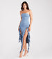 Captivate them with your flirty attitude in this on-trend ruffled midi dress! Featuring a strapless straight-across neckline. a fitted bodice with ruched side seams. a midi-length hem with dual high-cut side slits. and ruffled trims and accents. this dress is perfect for a summer party. The buttery-smooth knit fabric offers plenty of stretch. Style with a rhinestone choker necklace and lace-up heels.