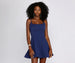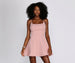 Leave a flirty impression in this absolutely adorable skater dress! It features a sleeveless bodice. a square neckline. adjustable spaghetti straps that lead to bar back details with a zipper closure. a lower back cut out with a zipper closure. a high waist seam. and a flowy skater skirt with a banded hem with flexible mesh to give the skirt shape. The dress is composed of a crepe fabric that offers moderate stretch.