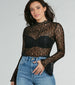 Get in a flirty mood for your next night out in this long sleeve sheer lace crop top! Crafted with a sultry sheer lace fabric for a sexy flair. the crop top features a trendy mock neckline. long fitted sleeves with flared hems. and a form-hugging fit for a chic silhouette. Style with a basic bralette and denim to get drinks with the girls!
