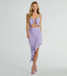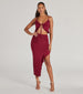 Make major flirty moves and create an enticing aura in this ruffled slit midi skirt! Designed with a stretchy smooth knit fabric. it features a high-rise elasticized waist for comfortable wear. ruching down the side seam to accentuate your curves. a sultry high-cut side slit with a ruffled hem. and a bodycon fit along the midi-length silhouette. Style with the matching crop top for a girl's night out!