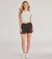 A floral chiffon skort features a flattering high-rise waist with a side tie for trendiness and a faux wrap ruffled mini-length hem. Perfect for styling with a basic top and boots.
