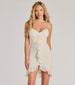 This airy mesh mini dress features a ruched silhouette to highlight your gorgeous curves and ruffled accents down the center and at the hem for that flirty flair. The mini-length bodycon fit is perfect for pairing with strappy stiletto heels.