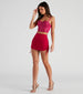 Flirty and femme. unveil a playful style in this knit skort featuring a sleek high-rise waist. adjustable side ruched ties. a bodycon silhouette. and a mini-length skirt overlay with shorts lining. Complete the look in clear strap mules.