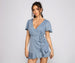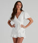 Bring those flirty vibes to your summer style with this absolutely adorable romper! It features short flutter sleeves. a V-neckline with a wrap-front design. a tie-front belt with tassel details. a faux wrap-front. fitted shorts. and ruffle accents. Complete your look with sleek earrings and cute wedges.