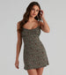 This mini dress requires zero gardening! It features a sleeveless. scoop neck. thin spaghetti straps. a ruched bust. floral print. and a bodycon silhouette. Complete the look with a cute mini tote.