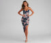 Flaunt your figure on vacay girl! This floral tropic midi dress is perfect for a dinner with a view. Featuring a sleeveless V-neckline. spaghetti straps. a strappy open-back. a bodycon silhouette. and an asymmetrical hem. Complete the look in chic wedges.