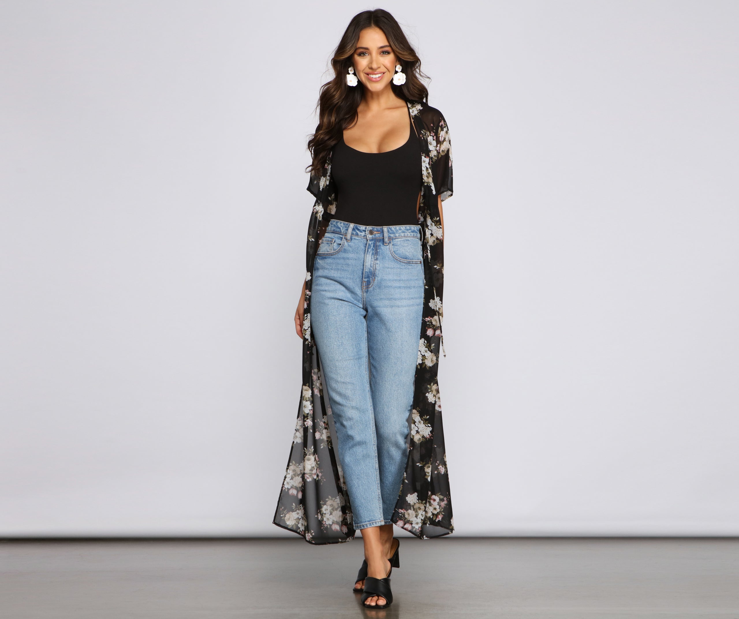 Channel those floral vibes with a pretty duster! The duster features a draped open front with a tie waist belt. kimono sleeves. a flowy long length. and a floral print. The duster is composed of a sheer chiffon fabric that offers a relaxed fit with minimal stretch. Complete look with a bodysuit and high waist jeans.