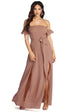 Get those pretty flowy vibes this spring with this off the shoulder maxi dress! It features short ruffle sleeves. a square neckline. a hidden back zipper and hook and eye closure. a tie front belt. two front slits. and a long maxi length. The mauve dress is composed of a lightweight crepe fabric with a short knit lining.