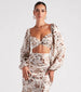 Whimsical and sleek. this satin crop top will inspire you to spread your wings! It features peasant long sleeves. a sweetheart neck. a stretchy smocked back. and a twisted cropped hem. The top is composed of an abstract butterfly print on non-stretch satin fabric. Style with the matching bottoms.