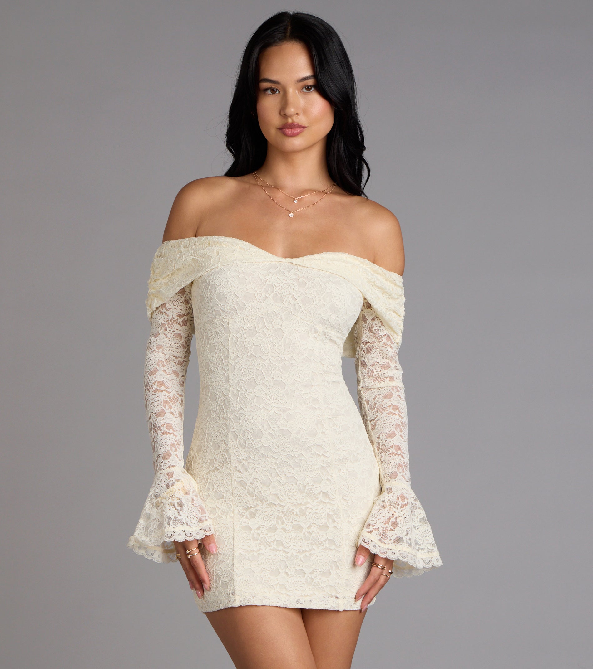 Soft. romantic. unforgettable—this lace mini dress stuns with off-shoulder draping. flared sleeves. and a curve-kissed fit. Perfect for bridal celebrations. birthday dinners. or any moment worth feeling dreamy.
